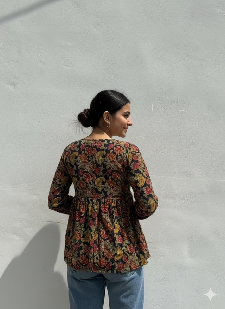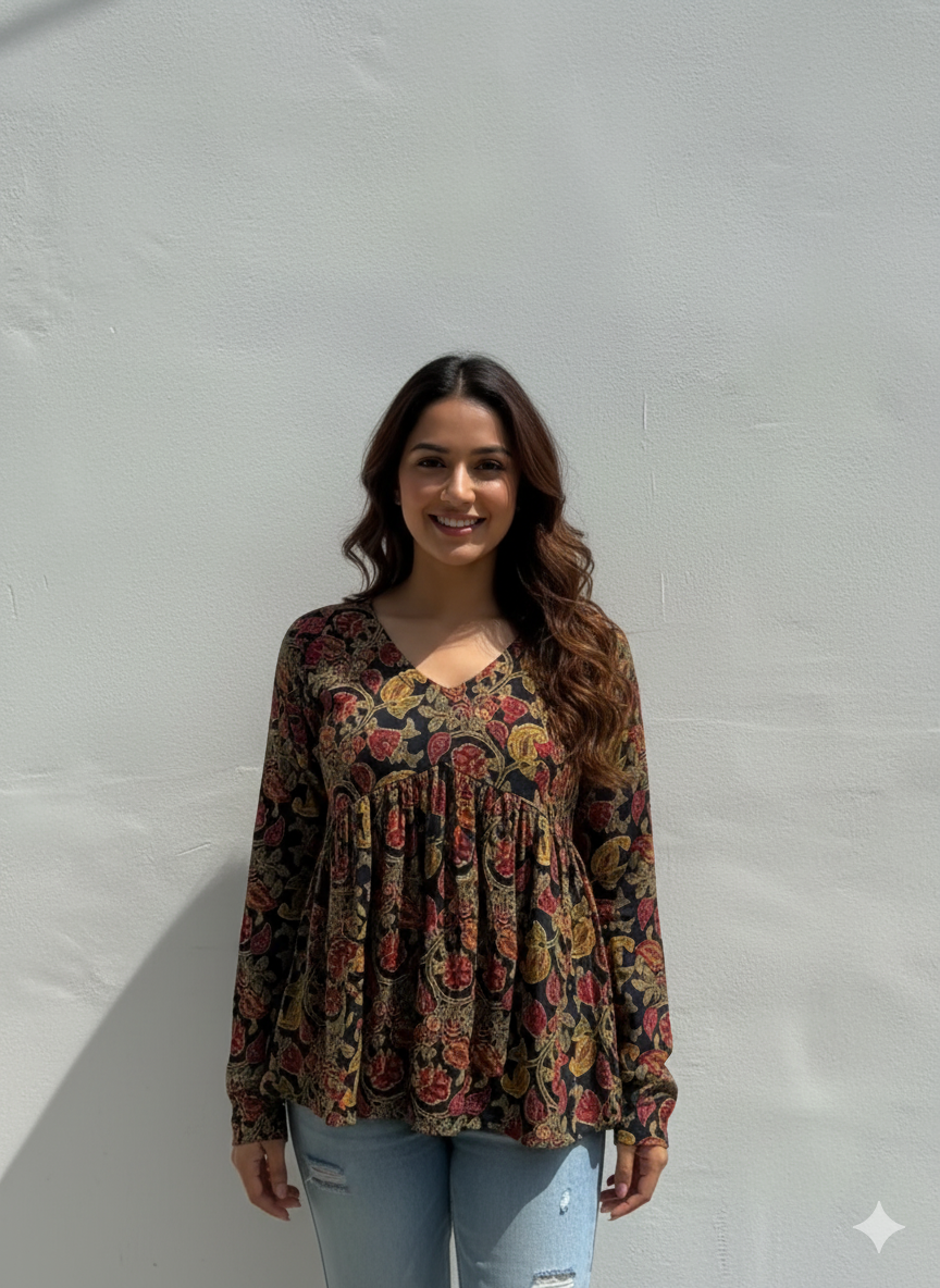 - Print: Intricate, dense floral and paisley print inspired by ethnic or bohemian textiles.