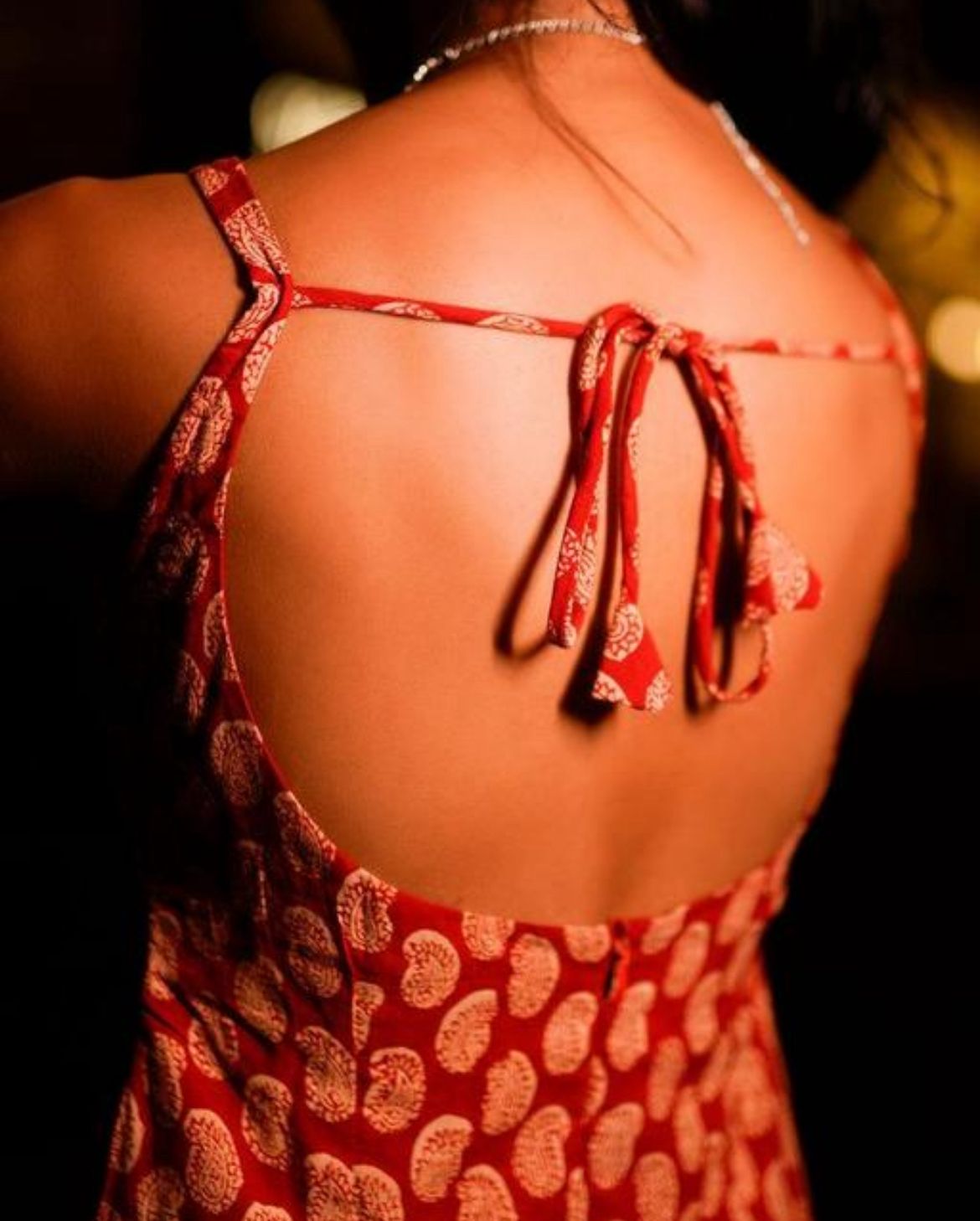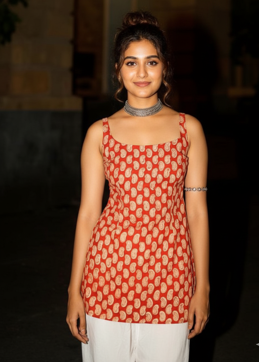 This Red Printed Tunic is a chic choice for an effortless ethnic look. The traditional block print pattern, featuring repeating small paisley butis, offers a rich texture and artisanal appeal. The sleeveless design and 100% Cotton fabric ensure maximum breathability and comfort during the summer months.