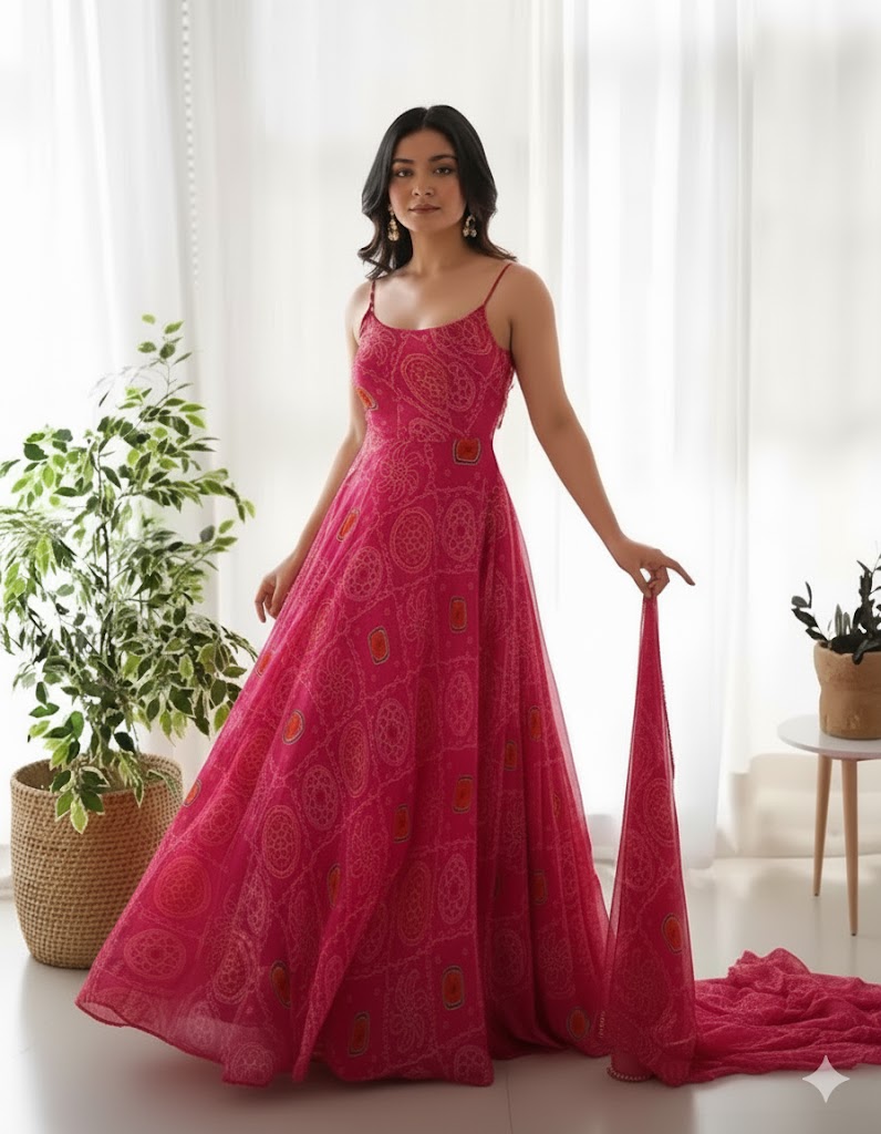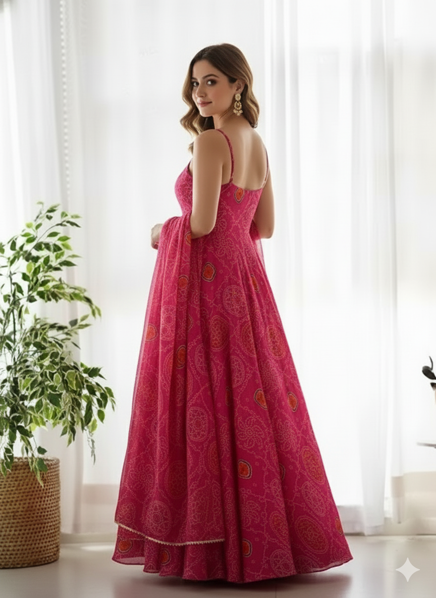 Step out in style with our handcrafted Bandhani Print Anarkali Gown. The rich, vibrant pink hue and traditional Bandhani pattern make this an essential addition to your ethnic wear collection. The full-length, flowing flare of the Georgette Anarkali creates an elegant silhouette, while the adjustable spaghetti straps offer comfort and a modern look. The included dupatta features a delicate border and is designed to drape beautifully. Features: • Fabric: Premium Faux Georgette • Print: Authentic Bandhani/Tie-Dye Style Print • Style: Full-Flared Anarkali Gown • Inclusions: Gown and Matching Dupatta • Care: Dry Clean Recommended. Styling Tip: Pair with traditional gold jhumkas and embellished sandals for a complete wedding-guest or festive look. Available in sizes S to XXL.