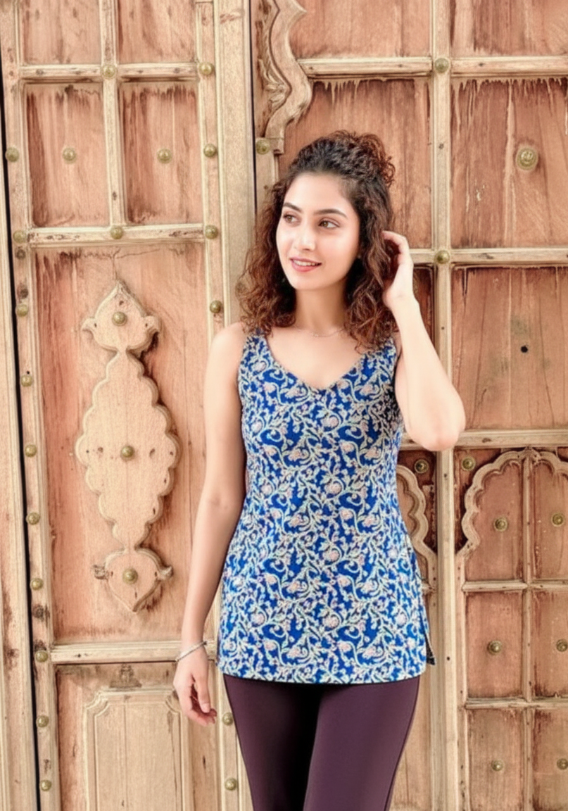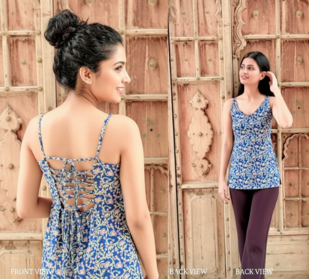 This Blue & Cream Tie-Shoulder Tunic is designed for comfort and unique style. The delicate bow details on the shoulders add a feminine touch and allow for adjustable strap length, ensuring a comfortable and customized fit. Crafted from breathable 100% Cotton, this top is ideal for daily wear, travel, and sunny weather. The traditional block-style print gives it an authentic, handcrafted appeal that complements oxidized silver jewelry perfectly.