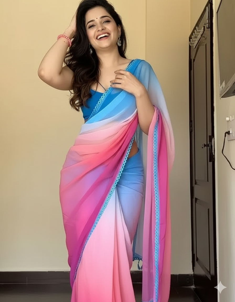 Pastel Pink and Blue Ombre Georgette Saree with Contrast Lace Border | Gradient Party Wear Sari