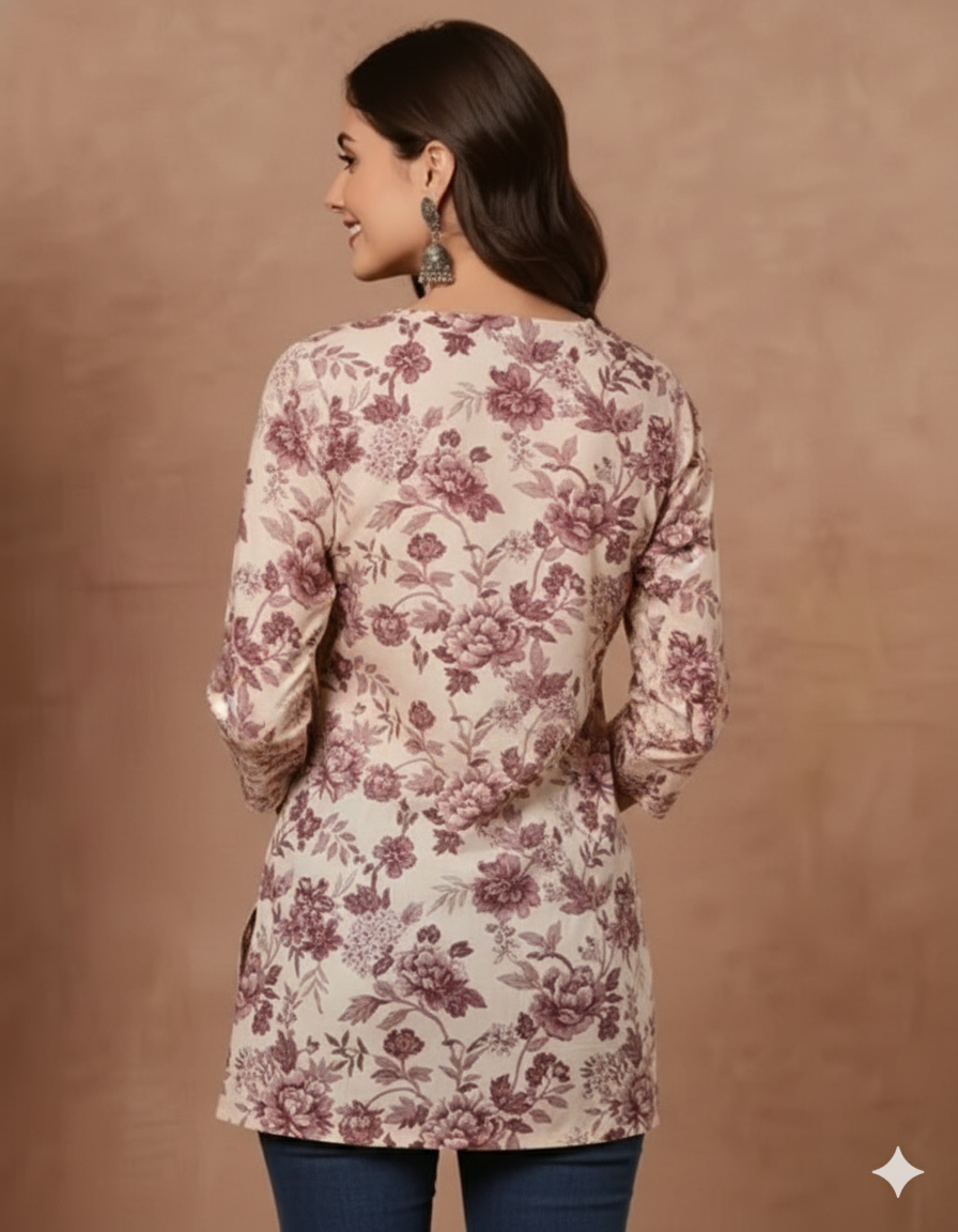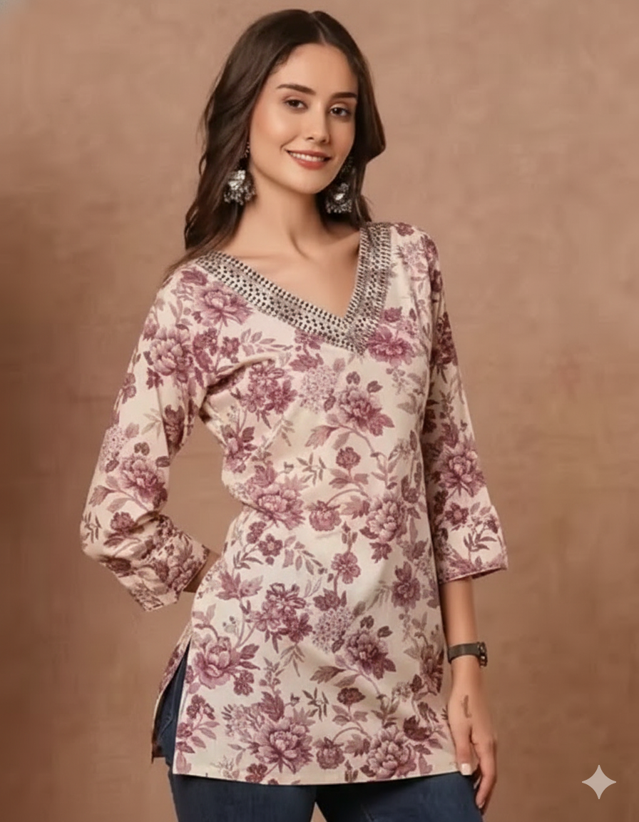 - Length: Tunic/Short Kurti length, ideal for pairing with jeans, leggings, or trousers.