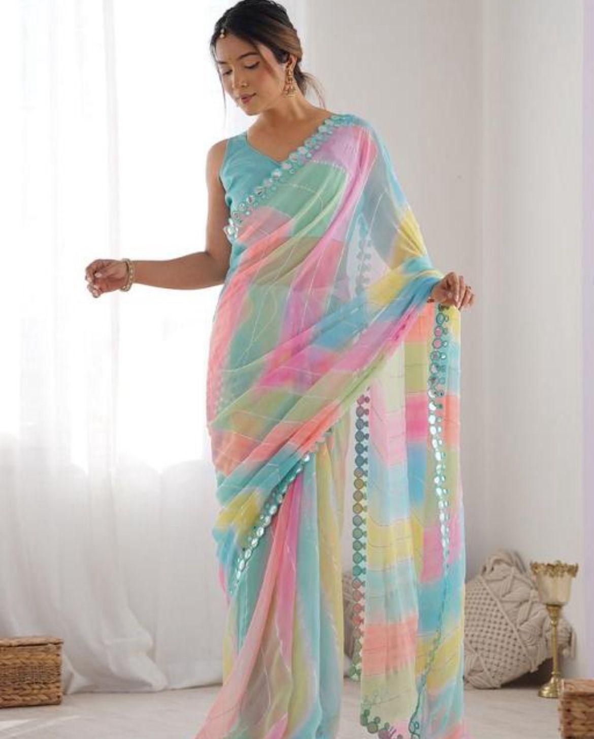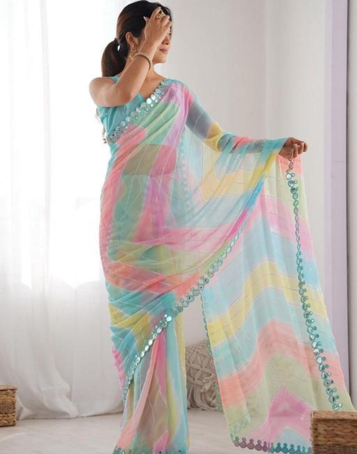 This Vibrant Multi-Color Saree is the epitome of modern festive style. The broad, undulating stripes of pastel colors (including blue, pink, yellow, and green) create a whimsical and lively look, perfect for joyous occasions. The careful placement of sequins adds subtle sparkle, while the heavy mirror and thread work border provides structure and traditional embellishment. It pairs perfectly with a contrast or solid color blouse to complete the look.
